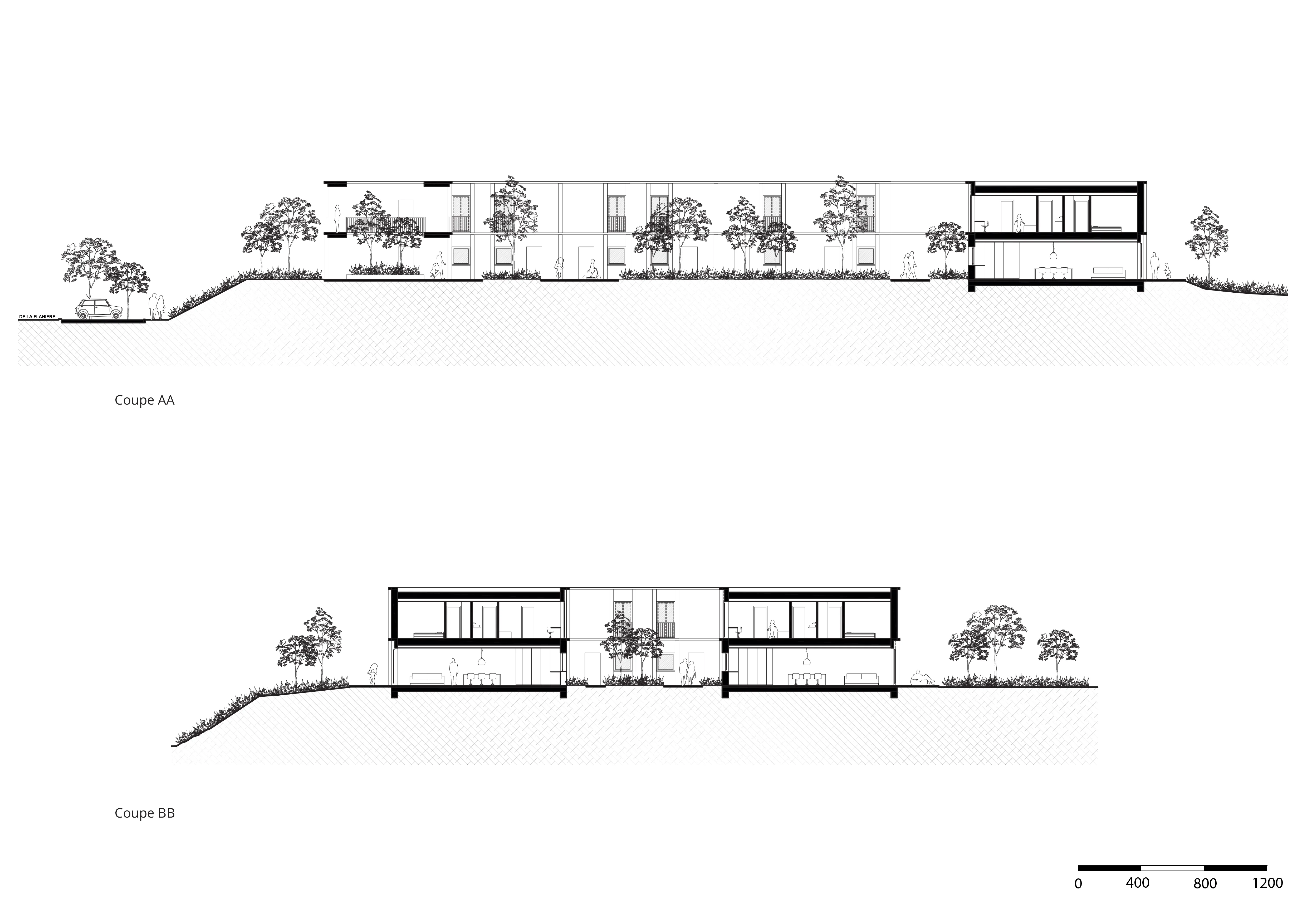 Lors de notre première rencontre avec le maître d’ouvrage, celui-ci envisageait une nouvelle étude de cinq petites maisons mitoyennes situées en front de rue, pour lesquelles un permis avait déjà été octroyé. Toutefois, au regard des caractéristiques du site — sa superficie, son potentiel paysager et son contexte urbain — cette intervention nous est apparue comme sous-dimensionnée et peu en adéquation avec les enjeux du lieu.
