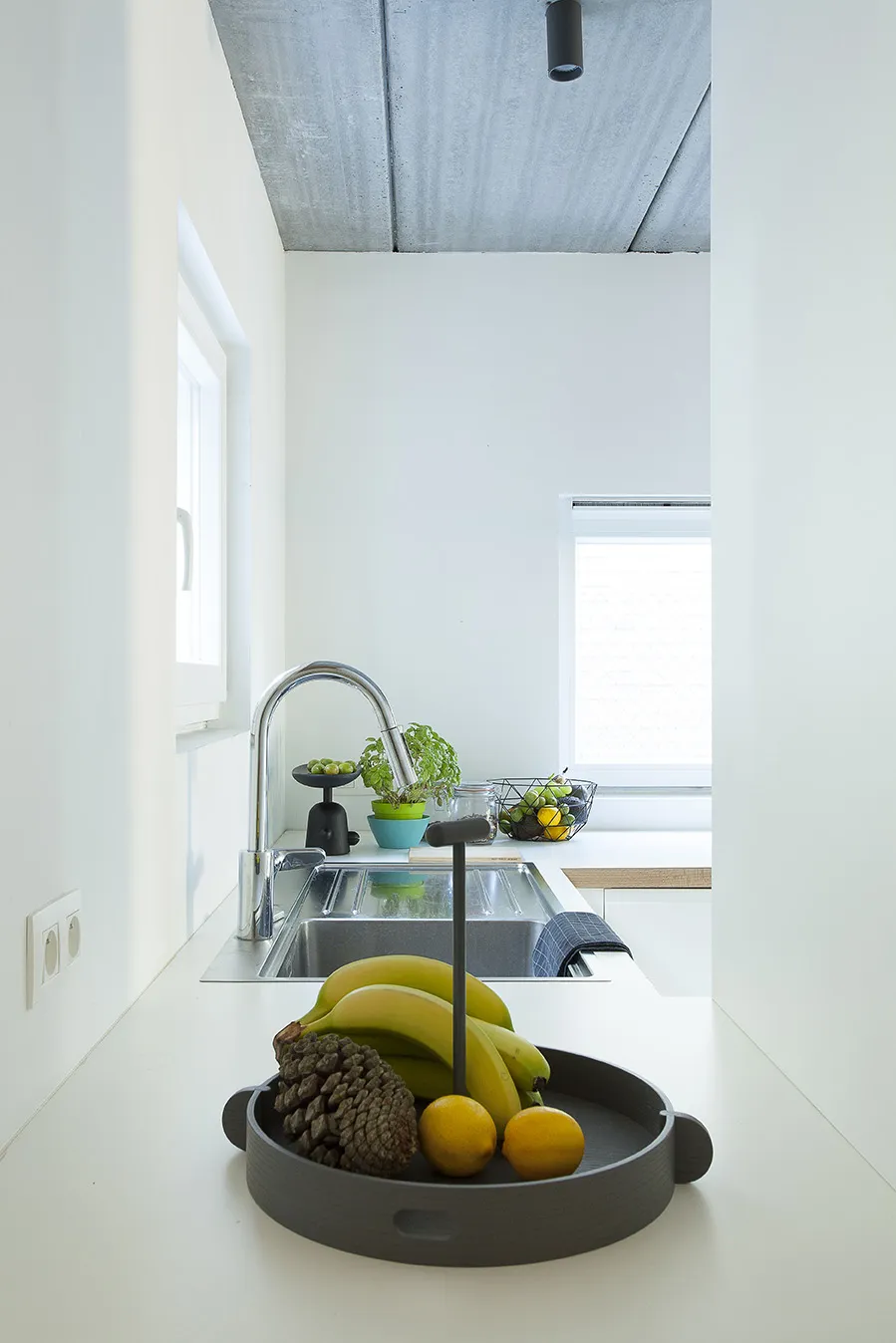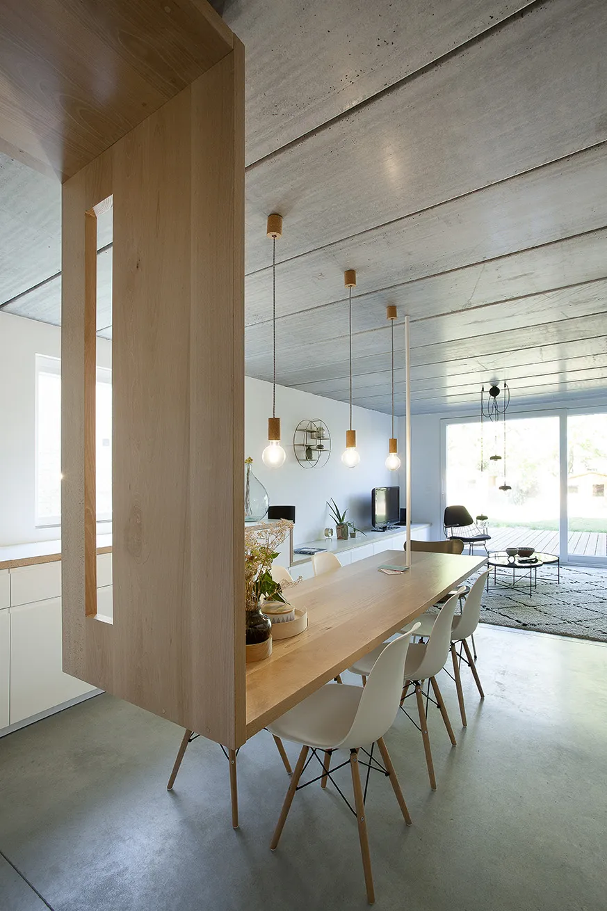 Loin des compartimentations traditionnelles, le projet mise sur un aménagement ouvert où le mobilier fixe joue un rôle structurant, à la fois fonctionnel et spatial. Les matériaux clairs, notamment le bois naturel, associés à une palette neutre, viennent renforcer cette impression de légèreté et de clarté.